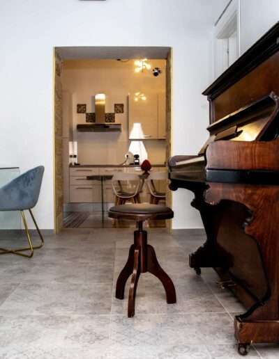 L’immobile è caratterizzato da un tetto ligneo a cassettoni decorato del 1600 nella zona cucina-soggiorno e da una volta decorata della stessa epoca nella zona letto e studio, meravigliosamente restaurati. Naturalmente, sono presenti tutti gli elementi essenziali del comfort: letto matrimoniale king size, un divano letto. comodini, tavolo con sedie e scrivania con poltrona. La zona studio è stata arricchita dalla presenza di un pianoforte d’antiquariato. L’appartamento accoglie una cucina completa, dotata di ripiano cottura ad induzione e tutte le stoviglie. La funzionalità è assicurato dalla macchina da caffè Nespresso con dotazione di capsule di benvenuto, cantinetta vini e inoltre tutta la tecnologia necessaria per un soggiorno di qualità, tra cui Wi-Fi ad alta velocità, Alexa e due Smart TV 4K. Sono presenti due bagni con doccia, phon e kit di cortesia.
